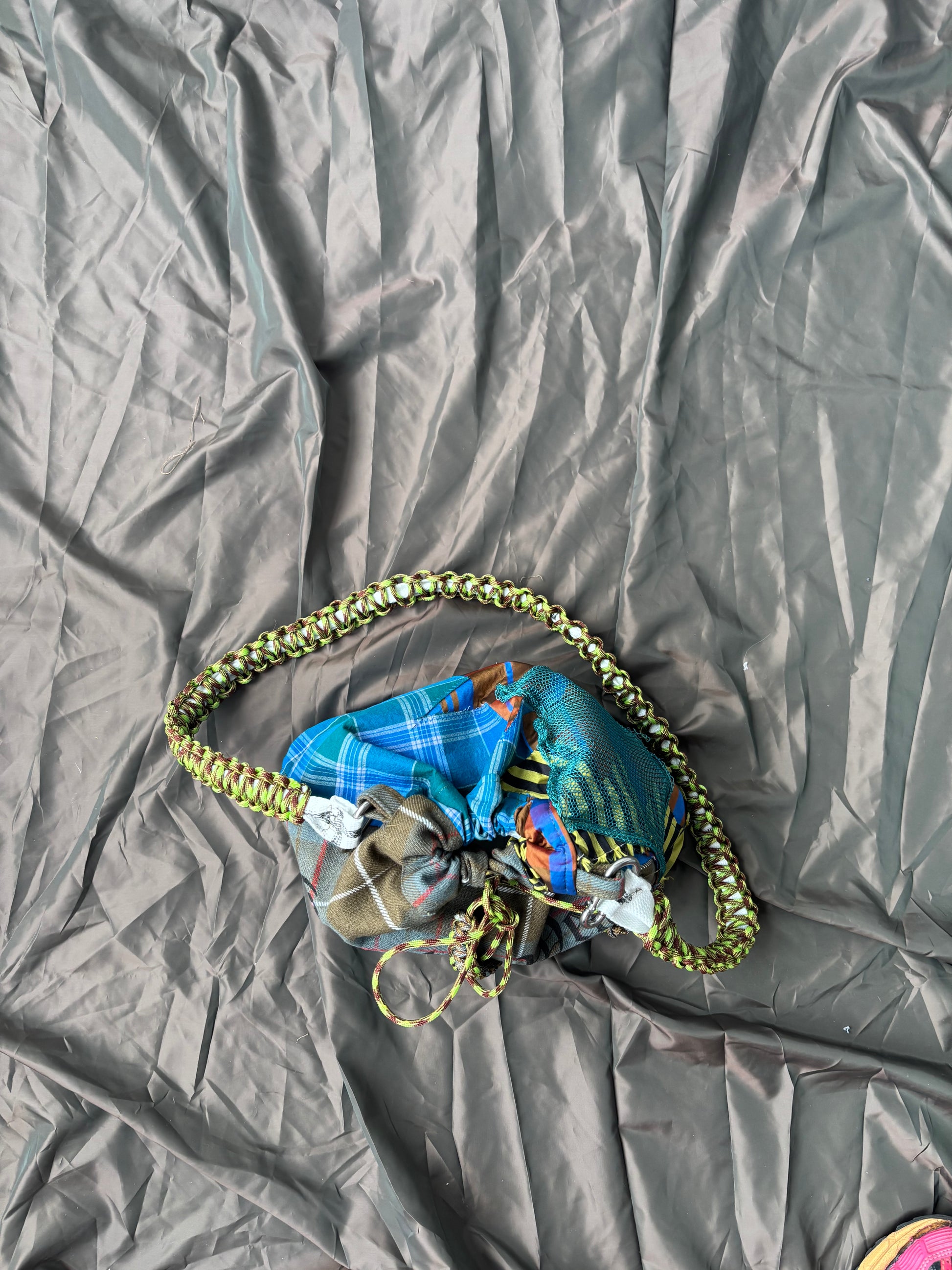 An absolute one of a kind piece made with fabric scraps and vintage second hand materials !